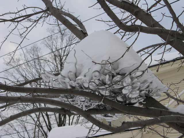 Artist Legend Lin views her installation of a nest of spoons on top of a tree branch. Legend Lin traveled from the Far East with an artist grant for a two month residency at the Vermont Studio Center in 2007.